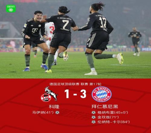 北京时间1月15日,德国足球甲级联赛第17轮展开较量,科隆坐镇主场迎战拜仁慕尼黑。上半场,格纳布里失误被断后马伊纳远射破门,奥利塞助攻格纳布里小角度破门扳平;下半场,伊藤洋辉助攻金玟哉头球入网完成反超,迪亚斯助攻卡尔低射破门。最终全场比赛结束,科隆以1比3不敌拜仁慕尼黑。