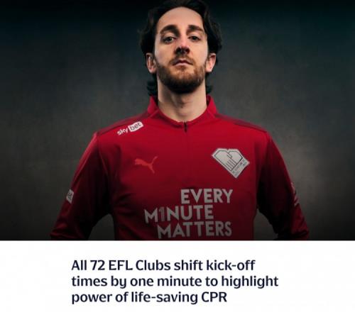 在2月5日至9日期间,英格兰足球联赛(EFL)的72家俱乐部将把36场比赛的开球时间推迟一分钟,以提醒人们在进行心肺复苏术(CPR)时每一分钟都至关重要。