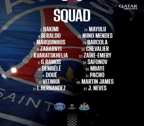 巴黎欧冠vs纽卡名单:登贝莱、阿什拉夫、若昂内维斯在列